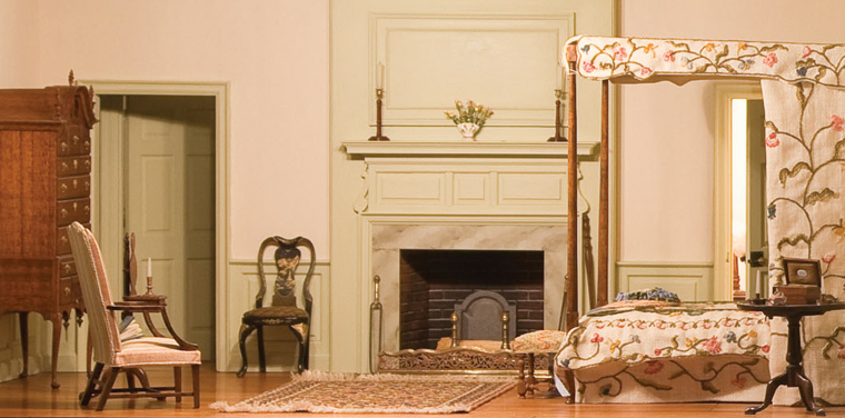 Self-described as a fanatic for function, authenticity, and detail, it comes as no surprise that William R. Robertson spent five years of full-time work building Twin Manors, two identical houses based on his research of 18th century historical homes from Virginia to Maine. Robertson envisioned the Georgian Colonial structure in 1979 and built a 1:87 scale mock-up to help him design the two, identical 1:12 scale versions. One manor is in the T/m collection and one is in Robertson’s private collection.