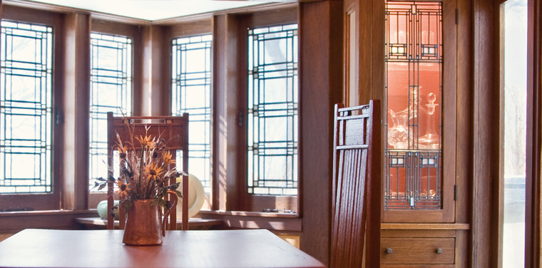 Prairie Style accessories in the room include works by a variety of other artists. Ceramics by Jane Mellick and Carol Mann sit on a matching table in the window. Delicate glassware by Jacqueline Kerr Dieber is kept in the built-in cabinets. And of course you can’t get much more “prairie style” than the floral arrangement of grasses and black-eyed Susans on the table by Nancy Van DeLoo.