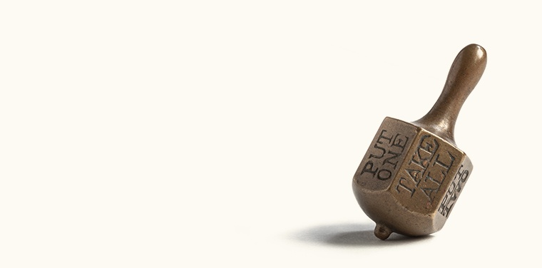 One of the most treasured Hanukkah traditions is of course spinning the dreidel in order to win that big pile of chocolate gelt! The game, which was popularized in sixteenth-century Germany, involves spinning a four-sided top. While this game commemorates the origins of Hanukkah, later versions of the game were created for secular play and simple gambling.