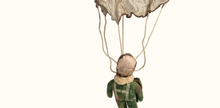 Thus, it comes as no surprise that the Prager and Rueben Company began making parachute trooper toys. The brown cloth Raggy-Doodle U.S. Paratrooper had a sewn-on aviator’s helmet and goggles. His painted aviation harness kept his heavy backpack and parachute in place. As you can imagine, T/m’s parachute trooper probably had many an adventure jumping out of bedroom windows, and off of tall trees, or maybe the occasional roof. Geronimo!