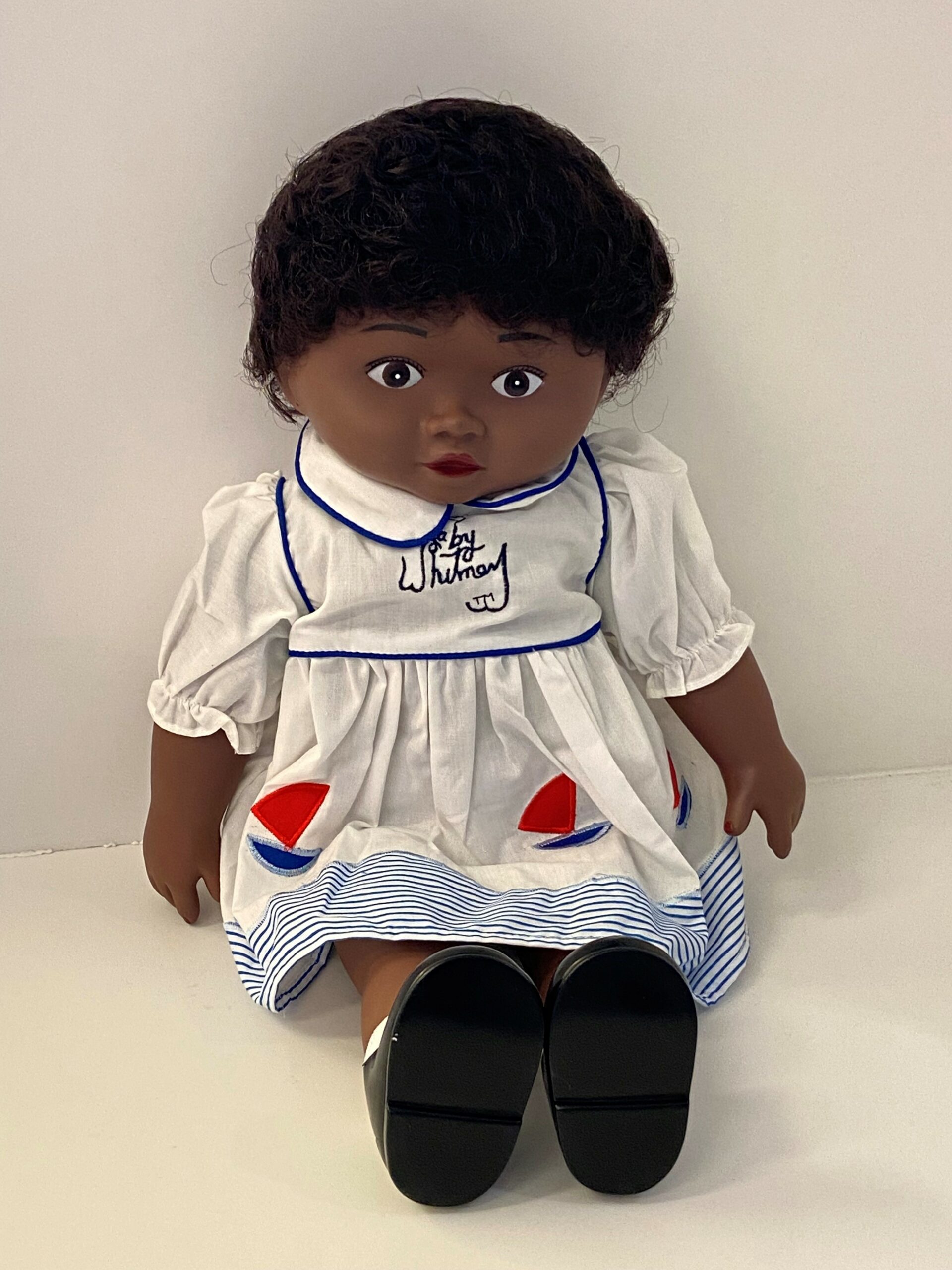 Baby Whitney was the brainchild of Melvin and Loretta Whitfield, who developed the doll in the mid-1980s in response to their frustration in not being able to find dolls that looked like Black children. The result was this doll that they described as, “based on esthetic and artistic historical data of both the African and Afro-American experience combined. The doll’s large head, with its features beginning at one-half disc, and its wide flat face are derived from the Ashanti Aqu-Ba sculpture of Ghana, West Africa.”