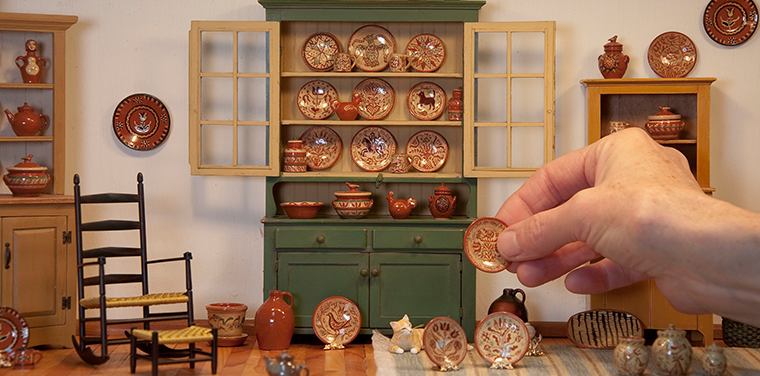 Jane Graber was a full-time potter at the Sauder Museum in Archbold, Ohio, where she made her first miniatures—gifts for the children who were visiting the museum. She has been making traditional Early American pottery in 1:12 scale since 1981. Her original designs are inspired by traditional motifs with techniques adapted from her experience with full-scale pottery.
