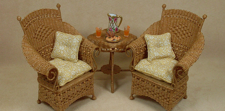 Vicky Sanfield handcrafts 1:12, 1:24, and 1:48 scale wicker furniture and baskets. After working in the interior design industry for seventeen years, she purchased two House of Miniatures kits at a garage sale to construct for her daughter. Since then, she has taken all of her knowledge in refinishing antiques, upholstering, quilting, sewing, painting, and wallpapering and applied it to creating her own miniature designs.