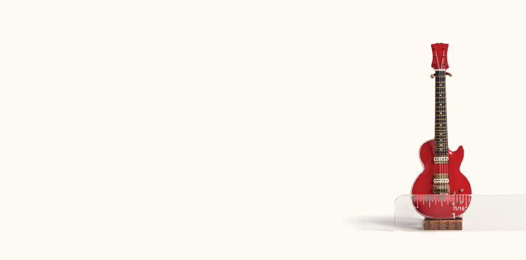 Unfortunately, there’s no Stairway to Heaven being played on this fine-scale miniature Les Paul (or maybe that’s fortunately, depending on what camp you fall in!). A favorite of visitors to The National Museum of Toys and Miniatures, this solid body electric guitar with white trim, brass tuning pegs and finger markings, and six strings is the work of fine-scale miniature artist Ken Manning.
