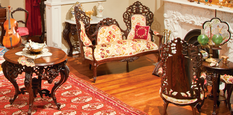 The center table in the Belter Parlor took about 40 hours to complete! Warner mainly used rosewood for the elaborate pierced carvings of the Belter style. John Belter himself favored rosewood and its ability to be bent and shaped without splitting or cracking like a more solid wood. In 1856, Belter patented a lamination process that allowed layers of wood to be more easily steamed into curves and carved.
