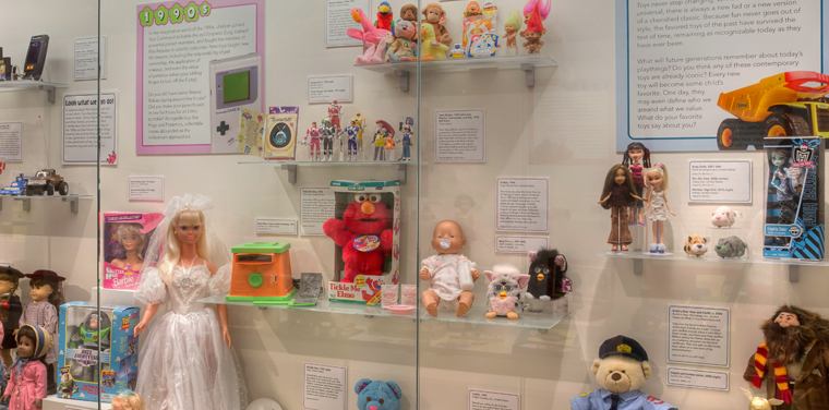 The crazes continue as the 1990s decade of Gotta Have It: Iconic Toys of Past Decades recalls Tickle Me Elmo, Beanie Babies, Tamagotchi, and Pokemon. At the top of every child’s Christmas list in 1998 was Furby, a battery-operated, highly-animated (and very annoying if you had a sibling who forgot to turn Furby off!) toy that spoke its own language: Furbish. With the ability to learn 800 English phrases, Furby was believed to be so intelligent that it was banned from National Security Agency offices for fear the toy could unknowingly divulge state secrets.