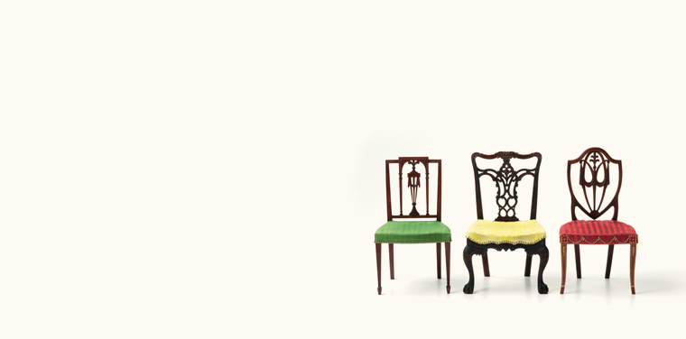 Artist Linda LaRoche received a commission from T/m co-founder Barbara Marshall to create a series of works showcasing her skills. Specializing in hand-carved wooden furniture, LaRoche researched measurements documented in the Kaufman Collection catalog. For the Cadwalader chair, she was granted special access by the Metropolitan Museum of Art to photograph and measure the full-scale chair. Using that research, LaRoche was able to precisely scale down the designs and determine the best approach to carving the delicate details. Unlike Goldilocks, we think all three of these chairs are “just right!”