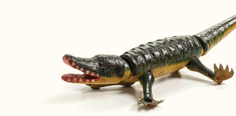 The circus initially included Humpty Dumpty the clown, and a barrel, chair, and ladder. Later, Schoenhut added circus performers, a ringmaster, acrobats, a lion tamer, and several animals to encourage sales. Humpty Dumpty, the performers, and animals were fully jointed with elastic cord allowing children to position their heads and limbs. The circus, ranging in price from 50 cents to six dollars, was a hit nationally and internationally with exports to Europe, Australia, and South Africa. Believed to be one of the first play sets developed in the United States, Schoenhut followed up with others, including this alligator. Stay tuned to see its set: Teddy Roosevelt’s Adventures in Africa!