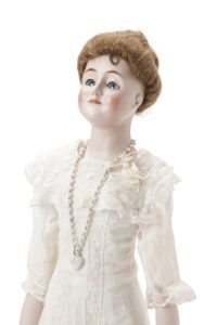 In the exhibit you will learn that Harriet Penney was born in 1898, a time when major changes were happening in America with technology, lifestyles, and attitudes. Harriet was given the doll in about 1910 and enjoyed playing with her in the attic playroom of her grandfather’s house in Washington, Kansas, along with her sister. In 1926, Harriet married Charles Roop, and they had three daughters. After Harriet died, daughter Patricia inherited the doll, and later donated it to T/M.