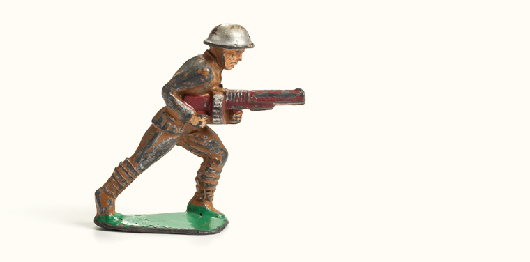 Toy armies evolved from figures of men on horseback with bayonets to soldiers equipped with rifles and machine guns. In the 1930s, the United States-based Manoil Manufacturing Company began to produce metal toy soldiers. This painted soldier, known as a “tommy gunner,” holds modern weaponry and poses in a combat position. He is one of T/m’s many examples of toy soldiers that reflect the conflict in which they fought, even if it was just a battle of the imagination.