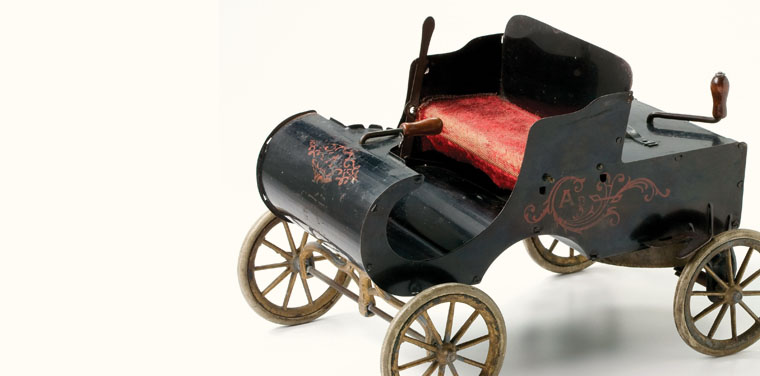 Because we don’t really see vehicles like the Curved-Dash Oldsmobile on the road anymore, it’s hard to believe that the full-size version of this toy was the most popular car in the beginning of the 20th century. Built between 1901 and 1907, the sled-like “horseless carriage” was the first mass-produced, gasoline engine automobile in the world. The wide-spread popularity of the new technology influenced toy companies like ACME Toy Works to emulate the Oldsmobile’s details, right down to the tiller steering and turn crank to start the engine!